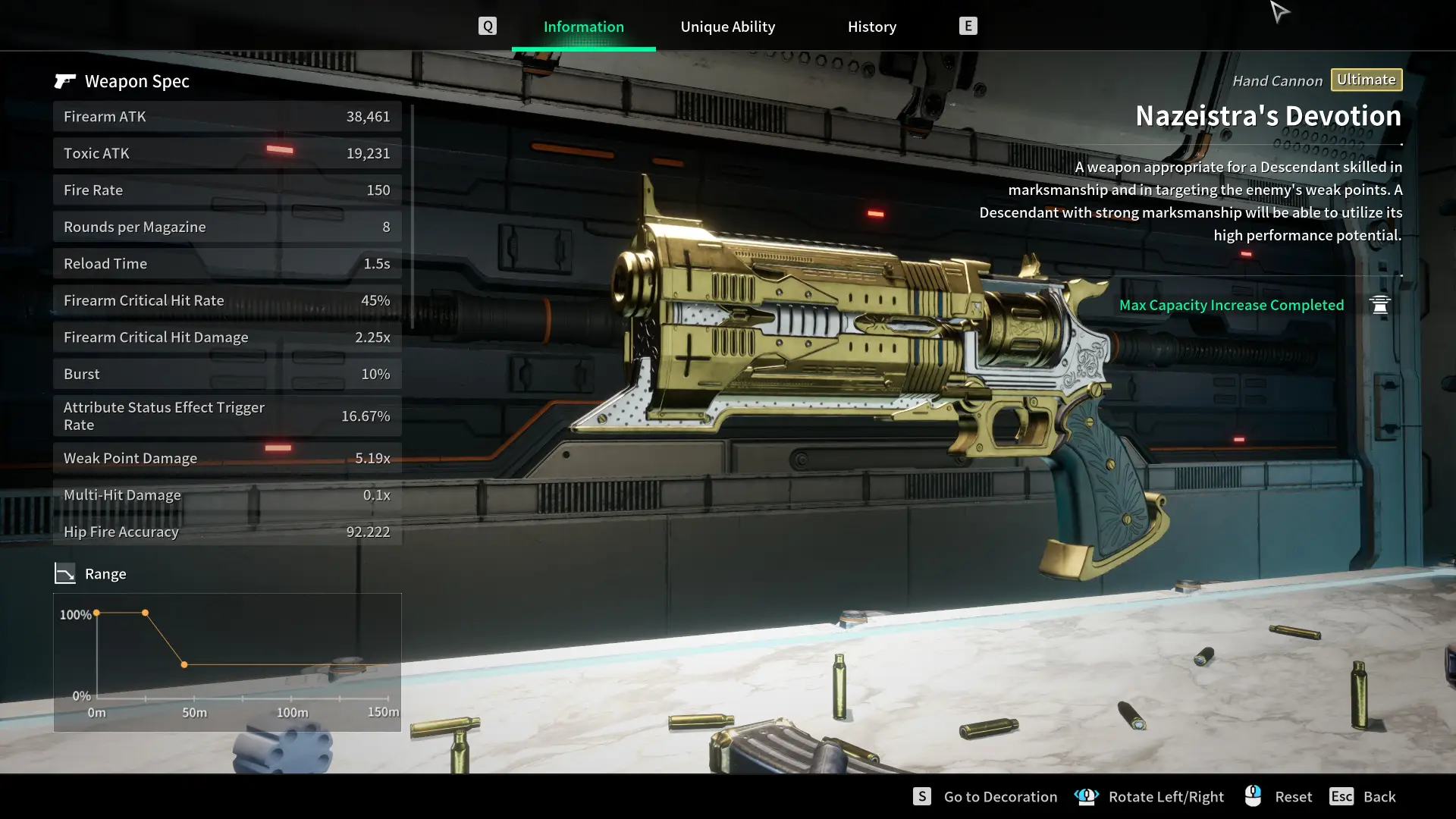 The Nazeistra’s Devotion is an Ultimate Hand Cannon. A weapon appropriate for a Descendant skilled in marksmanship and in targeting the enemy’s weak points. A Descendant with strong marksmanship will be able to utilize its high performance potential.