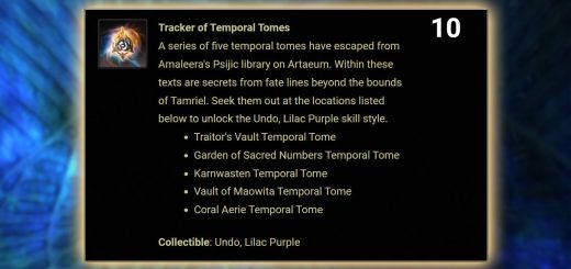 Welcome to the ESO Tracker of Temporal Tomes Achievement Guide. Finding all five Tomes and completing the Tracker of Temporal Tomes Achievement awards you with the Undo, Lilac Purple Skill Style. In this guide you will find all five Temporal Tome Locations with lists, maps and pictures. Name: Tracker of Temporal Tomes Type: Achievement DLC […]