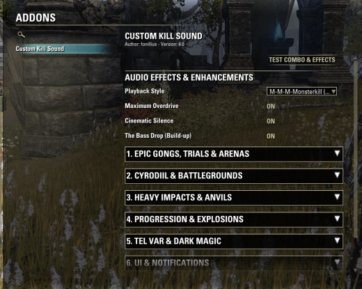 Custom Kill Sound-When you defeat enemy (in cyrodiil, duel or bg, or any other form of PvP) this plays “custom” killblow sound, uses ingame sounds and “edits” them to sound more customREADME:-Prerequisites LibAddonMenu-2.0 (LAM2): This is a library required to make the Settings UI. Download it from ESOUI or via Minion.-How to Use and Test In-Game Make sure you have LibAddonMenu-2.0 installed. Launch ESO and log in. Go to Settings -> Addons -> Custom Kill Sound.Pick the sounds you want to play and effects you want for those sounds. Press Test to hear chosen killblow sound. The addon will immediately try to play the sound. To Test PvP: Challenge a friend to a duel and kill them. As soon as their health hits 0, the sound will play.(Works in BGs and Cyrodiil etc too but only in PvP)-Folder StructureNavigate to your ESO Addons folder:(Documents) -> Elder Scrolls Online -> live -> AddOnsAddOns/└── CustomKillSound/ ├── CustomKillSound.txt └── CustomKillSound.lua(Note: APIVersion 101043 is for Update 43/44. ESO will still load it if “Allow Out of Date Addons” is checked).
