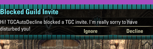 Hi! I’m Chance, the GM of The Gaming Council. In a recent patch, the way that our addons handled guild history broke, and it became possible for our addons to double-tap players with guild invites. The issue is quite deep and will take considerable labor hours to correct. I understand that players are thoroughly annoyed with invites, especially when they get more than one. The life’s work of our leadership is to bring ESO players deeper into content, help people make close bonds, and contribute to the longevity of The Elder Scrolls Online as a whole. Annoying people is just not compatible with our mission. I do apologize to the world for any annoyance that we have caused with our invites in the past. The technical issue we need to fix is quite deep. There are limitations that we need to tip-toe around that make solutions not poorly performant, ineffective, and difficult to create. However, I was able to pump this addon out relatively quickly. It detects when the player is sent an invite from TGC, generates an apology popup, declines the invite, and goes away. This was written intended to be a temporary fix while we un-f**k our code to make a permanent solution.It should be running by default, but to toggle the functionality, you can type: /blockinv on|off If people would like me to expand this addon to block ALL invites with a toggle, I can do that. Or, if the apology popup gets annoying, I can do that, too. With that being said, I am sorry that there is even a need for this to be generated in the first place.I hope that its presence makes your time in ESO more enjoyable and we see you in trials some day!