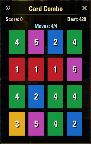 Change Log:——————–Version 1.0.0- Initial releaseDescription:——————–Card Combo is a compact 4×4 combo puzzle game you can play right inside ESO, inspired by Cards +1 on itch.io.Click a card to raise its value by 1, then build groups of 4 or more adjacent matching cards before you run out of moves. Every successful combo resets your moves and lets the run continue. If you fail to make a match before your moves run out, the run ends.Use /cardcombo to play.Features:- Fast, easy-to-learn puzzle gameplay- Persistent runs through reloads and restarts- Saved best score- Self-contained addon with no external libraries