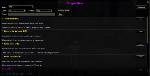 DungeonGear role-aware gear and dungeon recommendations, right in the game. Stop alt-tabbing to Alcast mid-dungeon-run. DungeonGear gives you a fast in-game answer to “what dungeon should I grind for my role, and which pieces do I still need?” with curated meta picks for every role, class-aware filters, complete build loadouts, and a personal gear collection checker. Features Seven category views Tank, Healer, DPS, Beginner, Monster, Overland, Trial. Each view lists hand-curated meta sets with weight, trait, slot, and a one-line reason why the set matters. Builds view 12 curated complete loadouts (e.g. Stamina DragonKnight DPS, Magicka Arcanist DPS, Any Class Tank, Beginner Overland DPS). Each build expands into 4 rows: a header with summary + web link, plus the three actual component sets (5pc body, 5pc jewelry+weapons, 2pc monster) pulled from the live data so you see dungeon source and reason for every piece. Collection view track any set (★ button on a row), then hit Collection to see a per-slot checklist of which pieces you already own vs still need to farm. Scans your inventory, bank, ESO+ bank, and equipped gear. Uses LibSets equip-type data so monster sets show only Head + Shoulders, not 10 irrelevant slots. Inventory highlight tracked-set items get a gold star overlay in your backpack and bank. No more missing that set piece you were farming for. Loot notifications when a tracked set piece drops, DungeonGear plays a quest-complete sound and prints a chat message. Filters class filter (7 ESO classes), damage type (Stamina / Magicka / Hybrid), Meta vs All toggle (All mode pulls the full LibSets library). Live search type-as-you-go substring filter that works on every view. Resizable window drag any edge or corner. Window position and size persist across sessions. Build links each build row has a Link button that prints its Alcast guide URL to chat for copy/paste. Usage /dg or /dungeongear toggle the window /dg tank jump directly to Tank view (also: healer, dps, beginner, monster, overland, trial, builds, collection) Click the Track button on any set row to add it to your collection watchlist. Optional dependency LibSets by Baertram unlocks “Showing: All” mode (full set library) and precise per-set slot filtering in the Collection view. DungeonGear runs fine without it; “Meta” mode and the curated data always work. Data philosophy DungeonGear.data is a hand-curated Lua table, not an auto-dump. Meta picks are sourced from current guides (Alcast, Hack The Minotaur, The Tank Club) and can be freely edited between patches just open DungeonGearData.lua and add/remove entries. Re-log or /reloadui to pick up changes. Not in this release No PvP / Cyrodiil / Battleground sets yet PvE focused. No auto-refresh of Collection while inventory is open click Collection again after looting to rescan. Build links open via chat (copy-paste), not a browser ESO addons can’t launch external URLs natively. Feedback, corrections to meta picks, and PRs welcome. Meta shifts every patch DungeonGearData.lua is designed to be the one file you edit. Copy the whole block into the ESOUI “Description” field when you upload. If you want shorter copy for the “Short Description” field (the one-liner that appears on the addon list page), use: ▎ Role-aware ESO gear and dungeon recommendations with tracked-set collection view and inventory highlighting.
