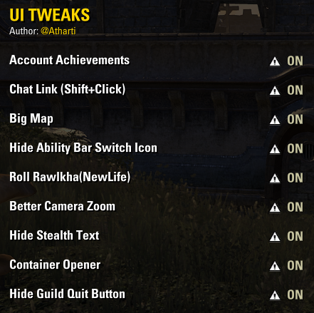 UI Tweaks A small addon to provide you with various UI tweaks and QoL features that you can toggle on.DependsOn: LibAddonMenu-2.0Features:Account Achievements:Hides “Earned by ” from achievements descriptions.Shift+Click Item Linking:Allows you to use Shift+LeftClick to link item in chat.Big Map:Makes your game map bigger, utilizing all free space for better view.Hide Ability Bar Switch Icon: That will remove the double arrow button from your ability bar.Roll Rawkha: During NewLife festival this feature will auto-abandon all Breda quests except one that sends you to Rawlkha to open 3 chests.Better Camera Zoom:Allows closer zooming to your character and first-person view while mounted.Hide Stealth Text:Removes the stealth-state text from your reticle.Container Opener:Adds a keybind to automatically open all containers in your inventory. You will need to assign a button after toggling this on.Hide Guild Quit Button:Hides the ‘Leave Guild’ button from the guild home panel to prevent accidental quitting.I do not accept feature requests for this addon.