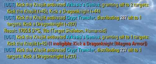 UltGrantTargetingThis is a diagnostic/research addon, not intended for general use.UltGrantTargeting is a testing tool designed to gather data about how ultimate-granting set effects select their targets. Specifically, it investigates:How do Arkasis’ Genius, Colovian Highlands General, and Cryptcannon Vestments choose which group members receive ultimate?Is target selection based on proximity, lowest ultimate, group index, or random?When a group member cannot gain ultimate (e.g., during Magma Armor or Bone Goliath Transformation), does the set skip them and pick someone else, or does it waste a target slot on them?The addon logs every ultimate energize event (ACTION_RESULT_POWER_ENERGIZE with COMBAT_MECHANIC_FLAGS_ULTIMATE) along with a full group state snapshot each member’s ultimate level, position, distance from the caster, combat state, alive/dead/online status, and whether they’re under an ability that blocks ultimate gain. All data is saved to SavedVariables for offline analysis.Source on GitHubSetupRequired dependency: LibGroupCombatStatsLibGroupCombatStats has its own requirements that you’ll also need to install:LibCombatLibGroupBroadcastOptional (but recommended):LibDebugLoggerSlash Commands/ugt status Show current ult, group state, active ult-blocking abilities, LGCS connection, verbose/discovery mode, and session stats/ugt verbose Toggle verbose mode (show events in chat; off by default)/ugt snapshot Print a group state snapshot to chat (positions, ult, combat status)/ugt scan Dump all buffs on self or group members, highlighting ult-blocking abilities/ugt discover Toggle discovery mode (log all power energize events to find unknown ability IDs)/ugt note Insert an annotated snapshot into the log as a test boundary marker/ugt procs Show recent tracked set proc events/ugt recent Show all recent ultimate energize events/ugt limit View or set savedvar size limits (sessions, procs, log entries)/ugt clear Clear the current session log/ugt help List all commandsDataAll events are saved to the UltGrantTargeting saved variable file. Each tracked set proc includes:The triggering ability (source, target, ability ID, ult amount)Additional targets that received ult from the same proc (within a 150ms debounce window)A full group snapshot at the time of the proc (ult values, positions, combat/dead/online status, ult-blocking state)A human-readable summary cross-referencing targets against the snapshot (identifies blocked, dead, or skipped members)To keep the saved variable file from growing unbounded, all storage is capped with configurable limits:Sessions: max 10 retained (oldest pruned on login)Procs: max 500 per session (oldest removed when exceeded)Log entries: max 2000 per session (ring buffer overwrites oldest entries in place, no table resizing)All three limits can be viewed and adjusted in-game with /ugt limit. The current session can also be wiped at any time with /ugt clear.You can then later review UltGrantTargeting.lua in your SavedVariables folder.Tracked SetsArkasis’ Genius ability ID 142660 (grants +44 ult to you and 3 group members on potion use)Colovian Highlands General ability ID 202843 (grants +15 ult/stack to you and up to 5 group members within 28m on player kill)Cryptcannon Vestments (Crypt Transfer) ability ID 195031 (consumes your ult and distributes it to nearby group members)