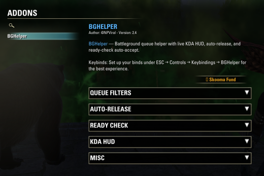 Change Log:——————–Version 2.5———— HUD toggle in settings now prints a confirmation message when toggled outside a BattlegroundDescription:——————–BGHelper is a lightweight Battleground utility addon for Elder Scrolls Online.It is designed to make Battleground gameplay smoother and more convenient without adding clutter. BGHelper focuses on four practical tools: smarter queue selection, automatic ready check acceptance, automatic release on death, and a clean live KDA HUD.FeaturesQueue FiltersChoose which Battleground queue types you want to enter. Toggle 4v4 and 8v8 independently, and allow Solo and/or Group queues based on your preference.Auto-Release on DeathAutomatically releases to respawn when you die inside a Battleground. The delay is fully configurable.Ready Check Auto-AcceptAutomatically accepts the match-found ready check when it appears. An optional delay can be set if you want a short review window before it triggers.Live KDA HUDA clean HUD shown only while inside a Battleground. It displays your Kills, Deaths, Assists, Damage Done, Healing Done, and current rank within your team.The HUD updates live, can be dragged anywhere on screen, locked in place when positioned, and supports adjustable opacity. Its position is saved as a screen fraction so it remains consistent across resolution changes.Keybind SupportBGHelper includes four bindable actions under ESC → Controls → Keybindings → BGHelper.Binding Queue Selected Battlegrounds and Toggle KDA HUD is recommended for the smoothest experience.Commands/bgq queue immediately/bgh print current settings/bgh queue queue/bgh settings open settings panel/bgh release on/off/toggle control auto-release/bgh hud toggle HUD visibility/bgh hud lock / unlock / reset manage HUD position/bgh chat toggle chat alerts/bgh version print current…