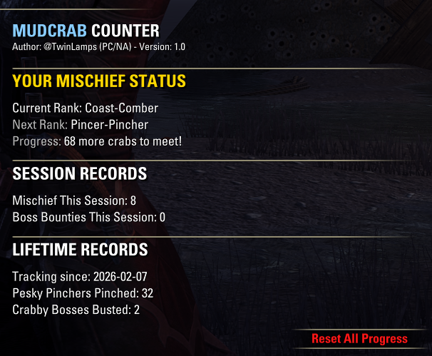 Tracks killing blows on mudcrabs & mudcrab bosses, both Total and Current Session (since login or /reloadui). Adds fun ranks in the dashboard via Settings: AddOns or /mccmenu.