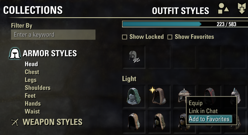 An Elder Scrolls Online addon that extends the Outfit Styles panel with a favorites system, letting you mark and filter styles you care about most.