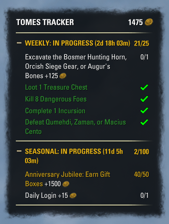 Tomes Tracker is a lightweight and easy way to track your weekly and seasonal Tome Challenges.